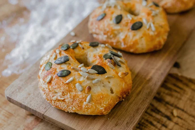 - Eigelb in einer Schüssel verquirlen. Bagels für eine goldene Kruste mit Eigelb bestreichen. Jeden Bagel mit je ½ EL Sonnenblumen- und Kürbiskernen bestreuen.