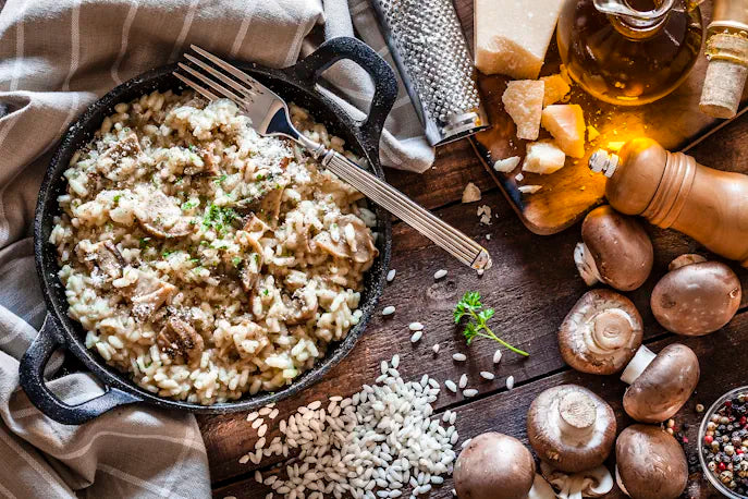 - Risottoreis (ungefähr so viel Gramm Reis wie Pilze)